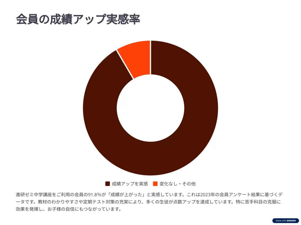 塾に行かずに進研ゼミ中学講座だけで合格した会員の第1志望校合格率は90.8%に達しているというデータもあり(2023年度)、その効果は高く評価されています。