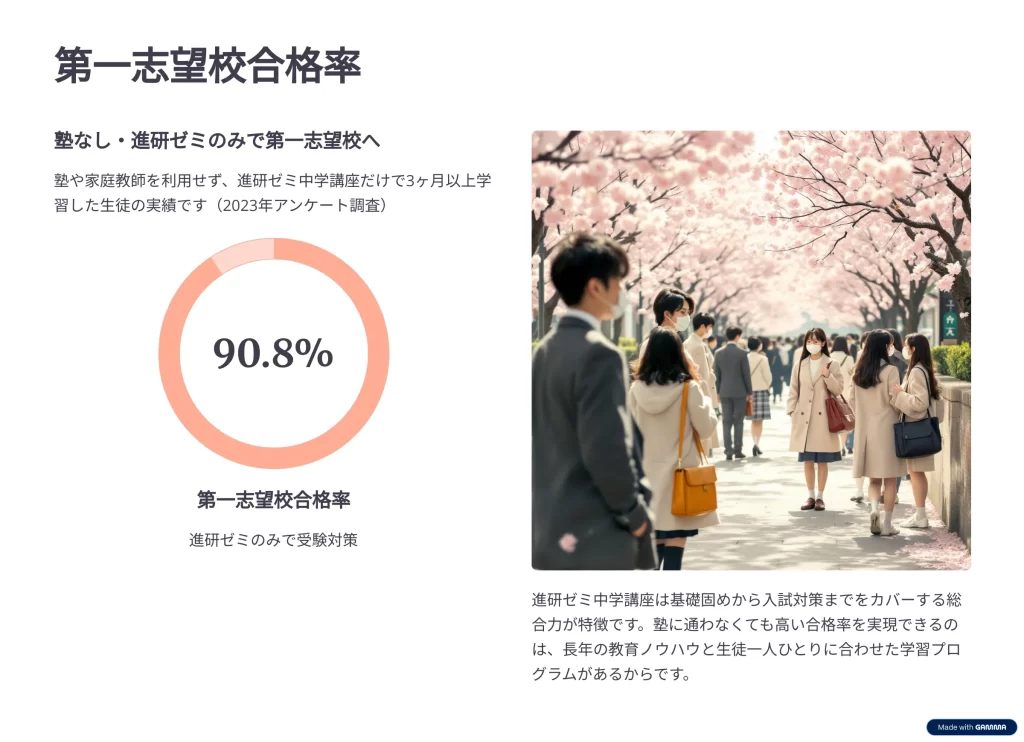 実際に、「塾に行かずに進研ゼミ中学講座だけで合格できた受験生も多くいる」という体験談もあり、第1志望校合格率は90.8%に達しています(2023年度)。