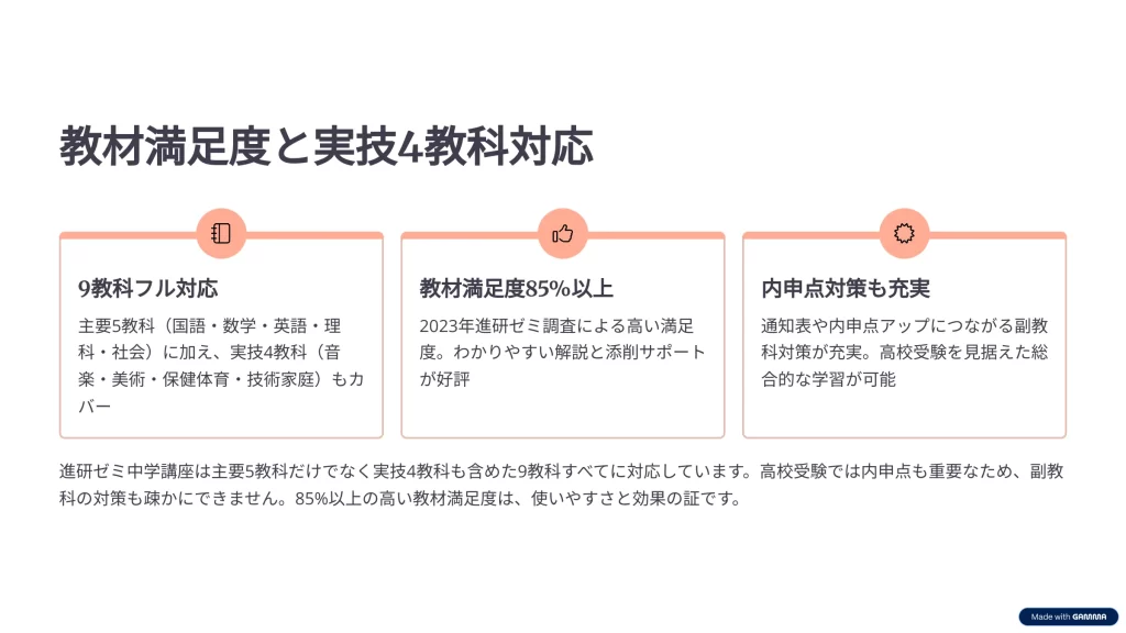 対応教科は、英語・数学・国語・理科・社会の主要5教科に加えて、保健体育、技術家庭、美術、音楽の実技4教科を含めた全9教科に対応しています。