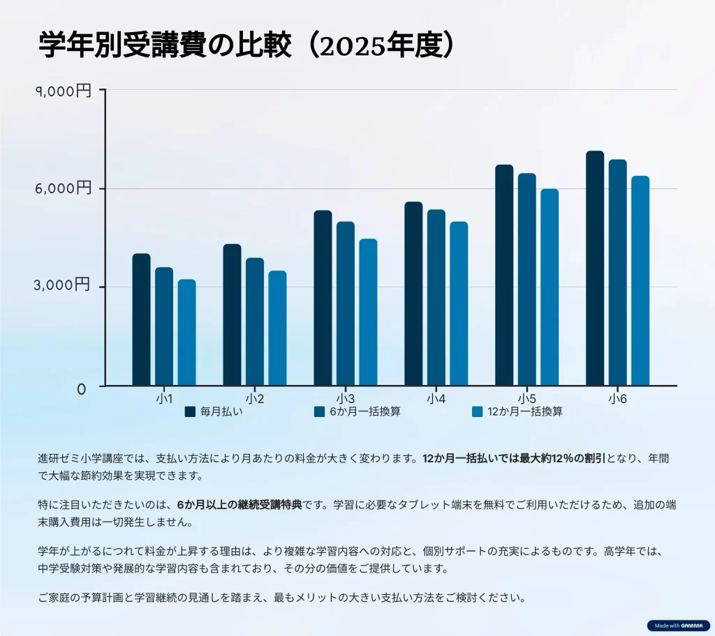 進研ゼミ小学講座の月額は学年ごとに異なり、1年生は約4,020円~、6年生は約7,150円。支払いプランは毎月払い、6ヶ月一括、12ヶ月一括が選べ、長期一括払いほど割安になります。