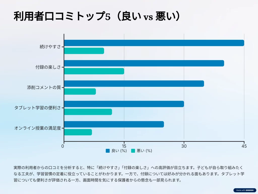 SNSやレビューサイトでは「子どもが楽しんで続けられる」「成績が上がった」との声が多数ある一方、「教材がたまる」「遊びに走る」との意見も。