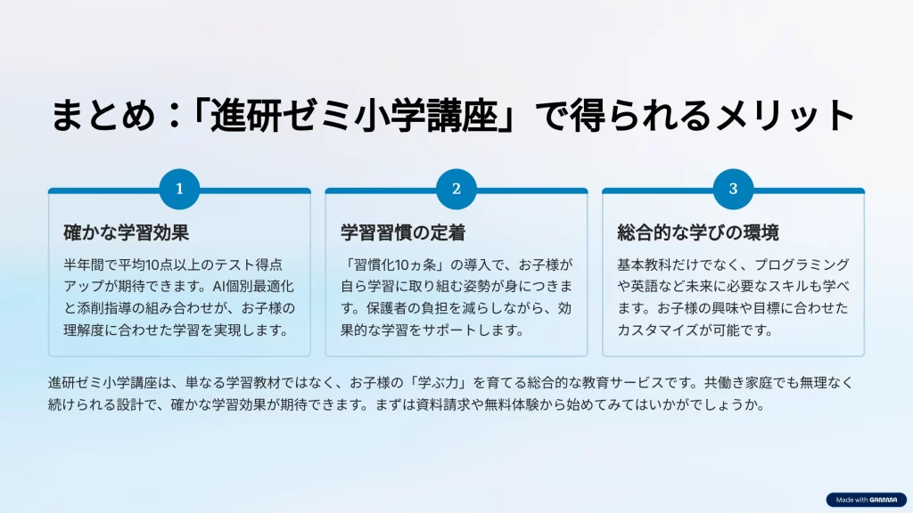 お子さんの学習習慣づくりと成績向上のサポートとして、進研ゼミ小学講座を検討してみてはいかがでしょうか。
